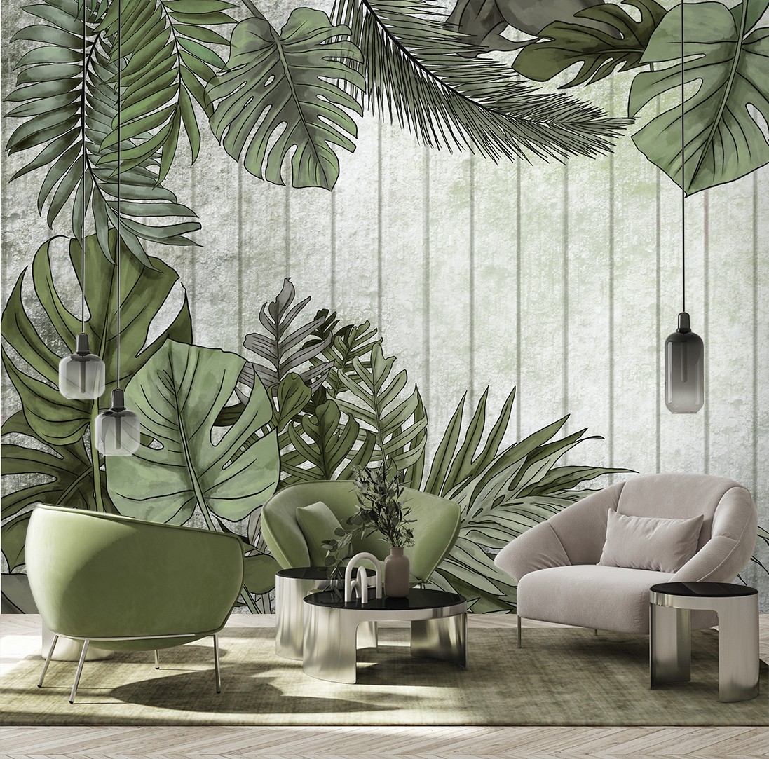 Fototapete Exotische Blätter auf Bretterhintergrund