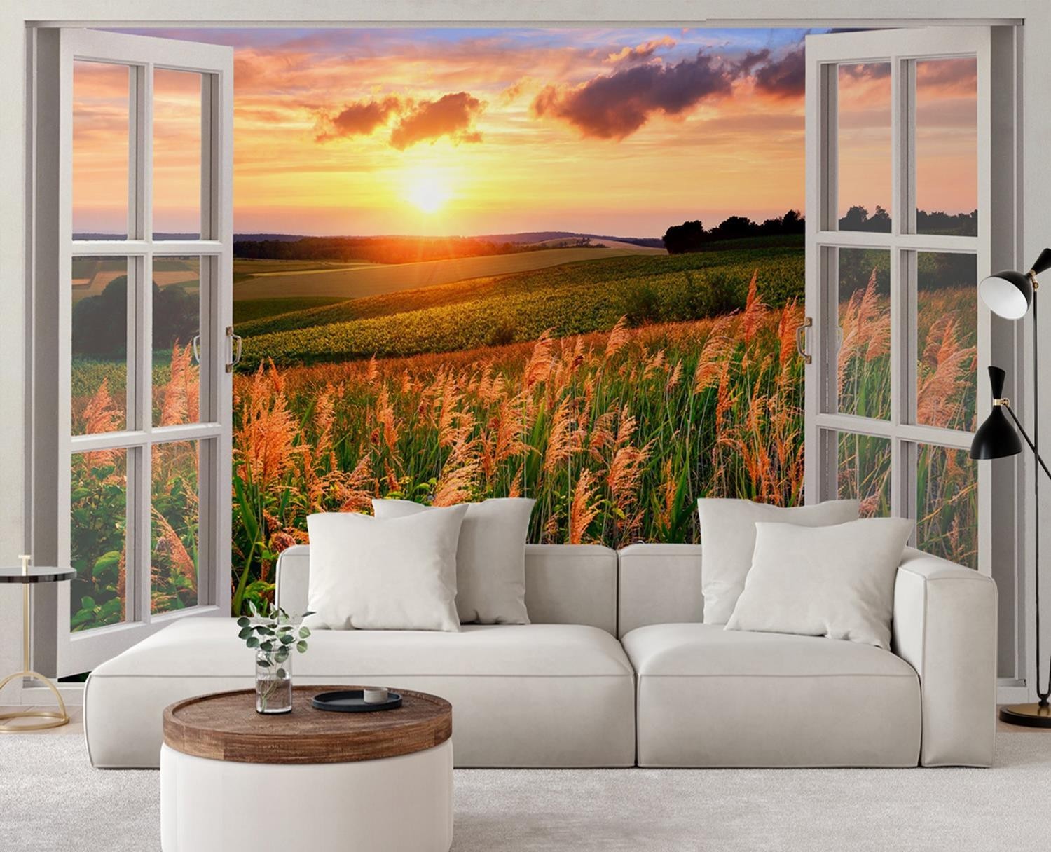Fototapete Fenster - Blick auf den Sonnenuntergang über der Wiese