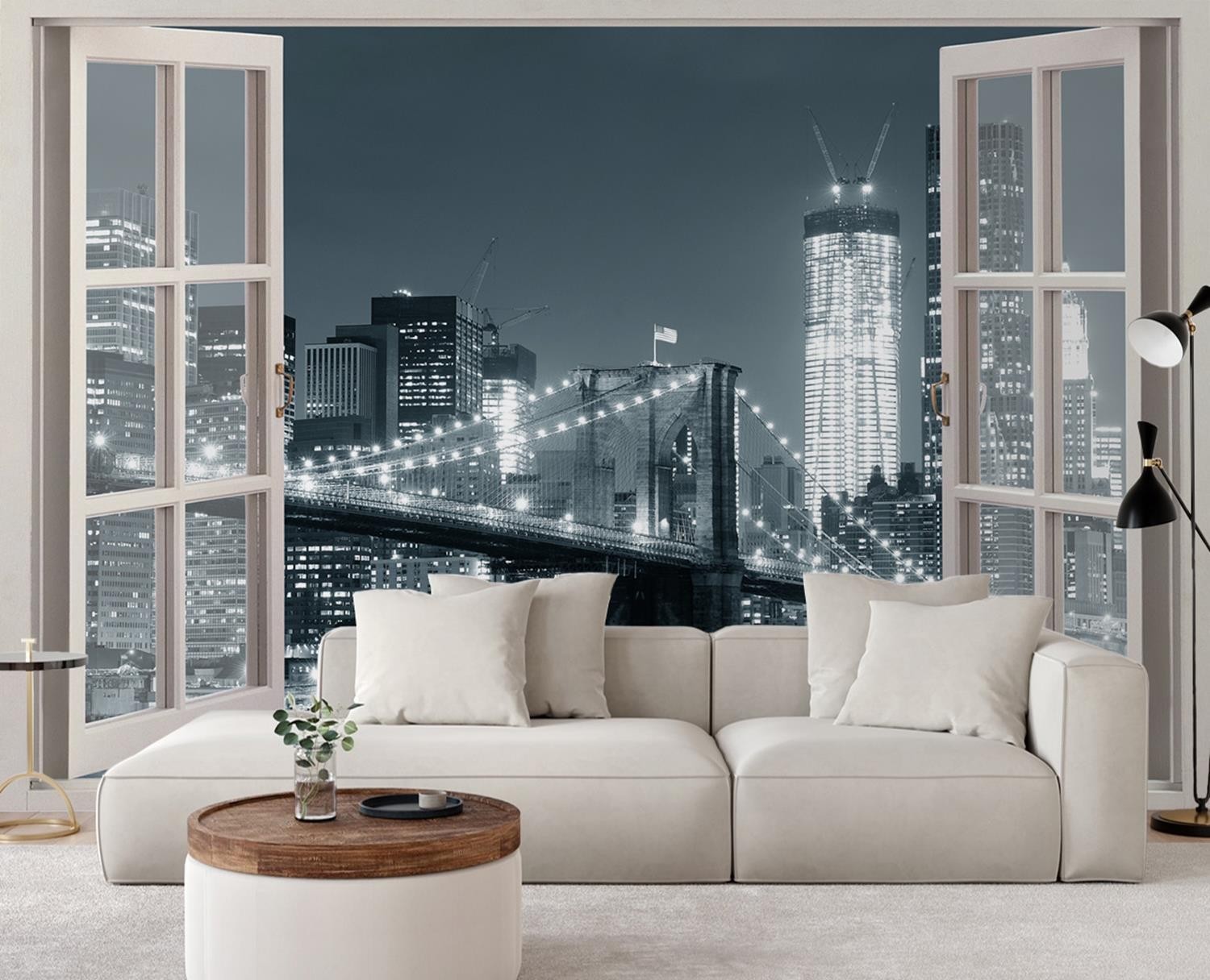 Fototapete Fensterblick New York City Brooklyn Bridge schwarz weiß