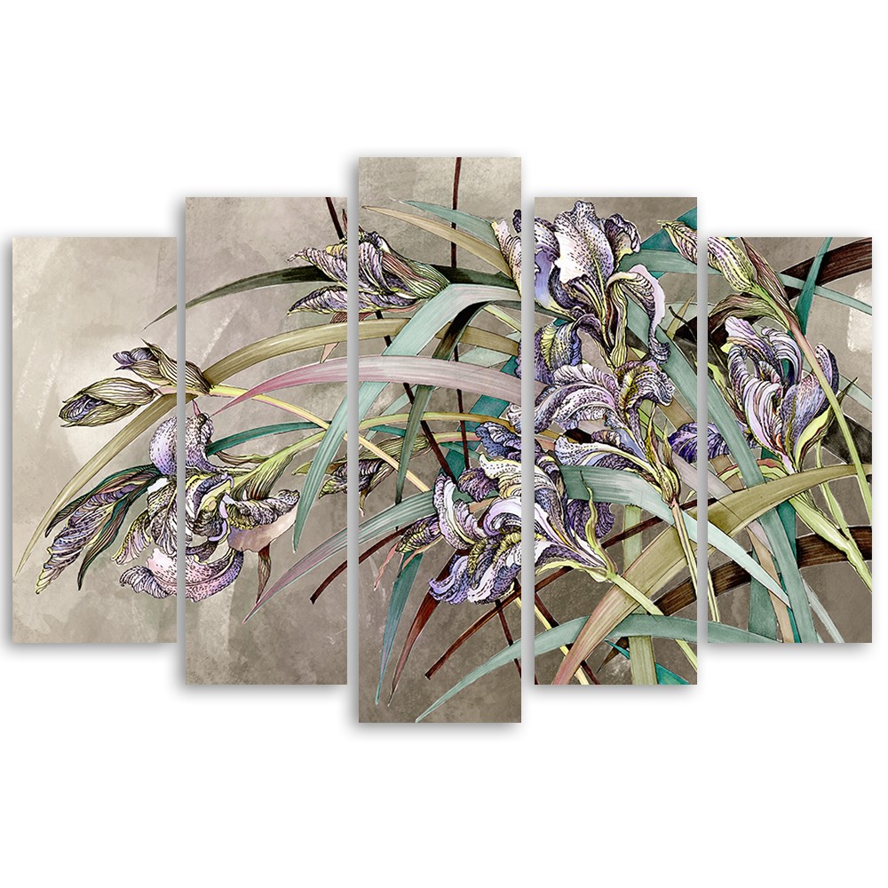 Leinwandbild 5 teilig, Iris Blumen im Wind