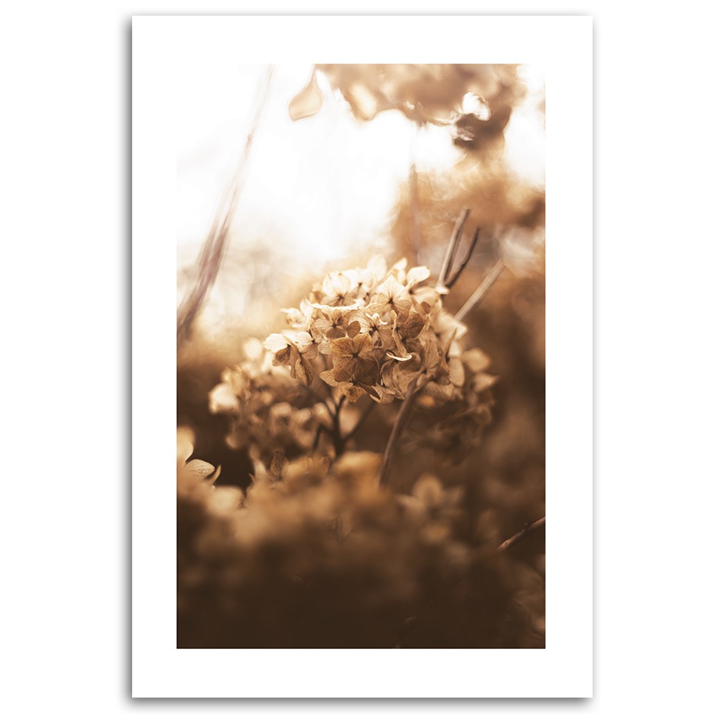 Leinwandbild, Verwelkte Hortensie bei Sonnenuntergang