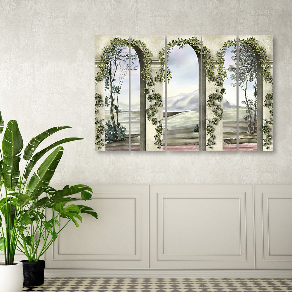 Leinwandbild 5 teilig, Säulen und Bögen mit Efeu