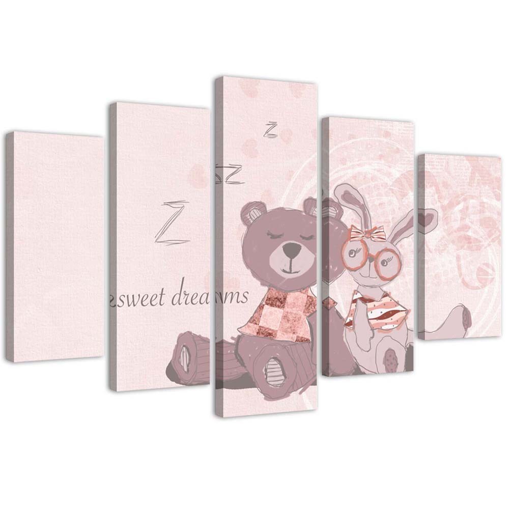 Leinwandbild 5 teilig, Teddybär Rosa Hase