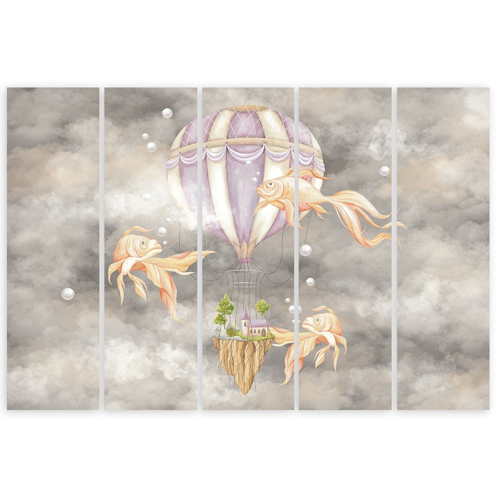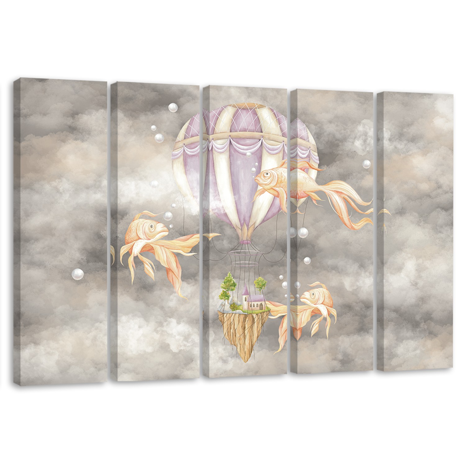 Leinwandbild 5 teilig, Heißluftballon fliegendes Haus und Fisch