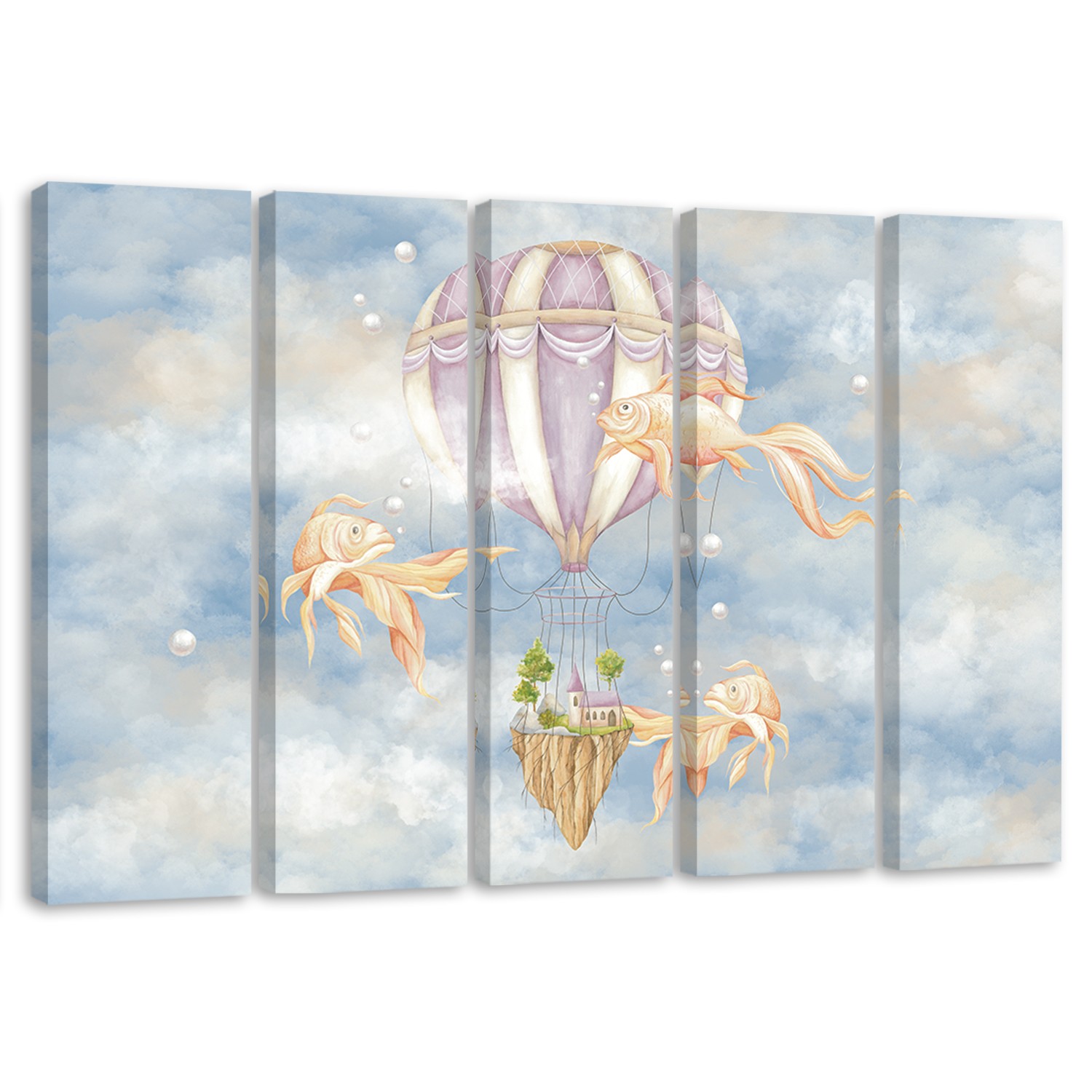 Leinwandbild 5 teilig, Heißluftballon fliegendes Haus und Fisch