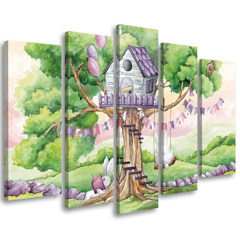 Leinwandbild 5 teilig, Weiße Kaninchen Hütte auf dem Baum