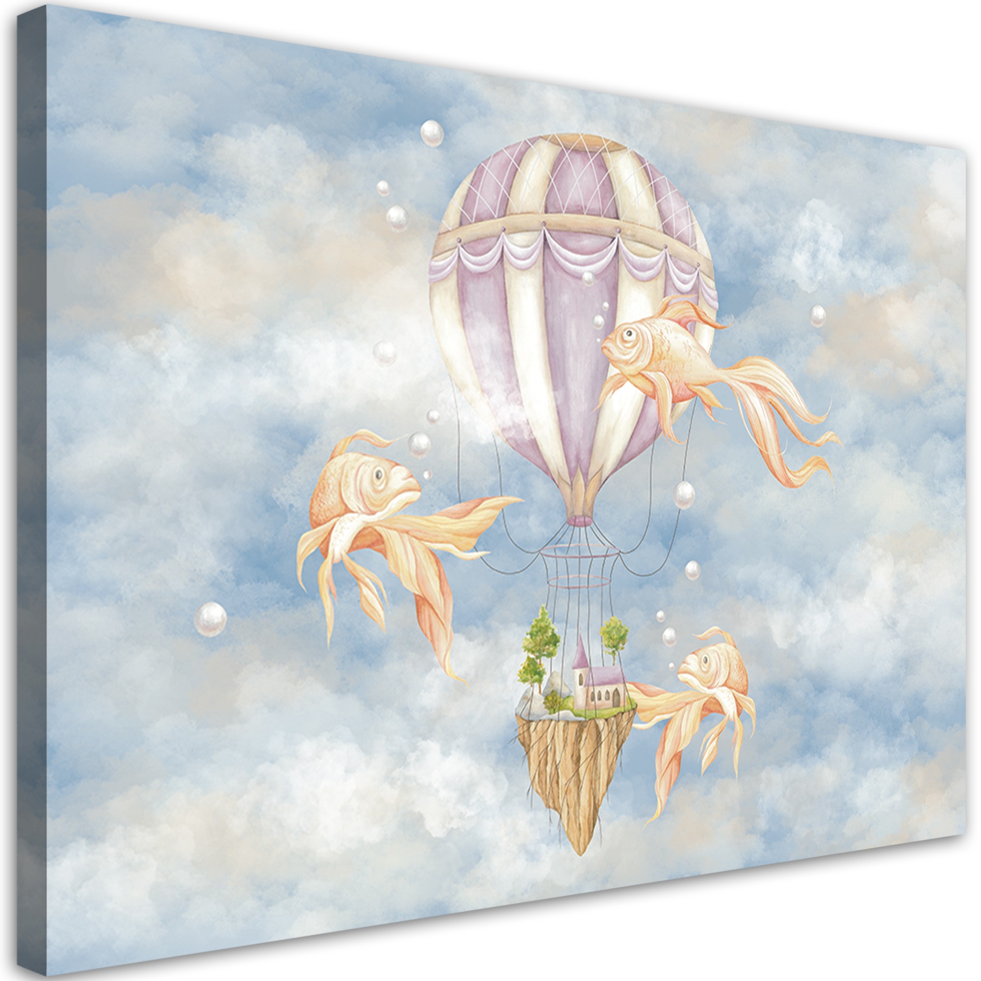 Leinwandbild, Heißluftballon fliegendes Haus und Fisch