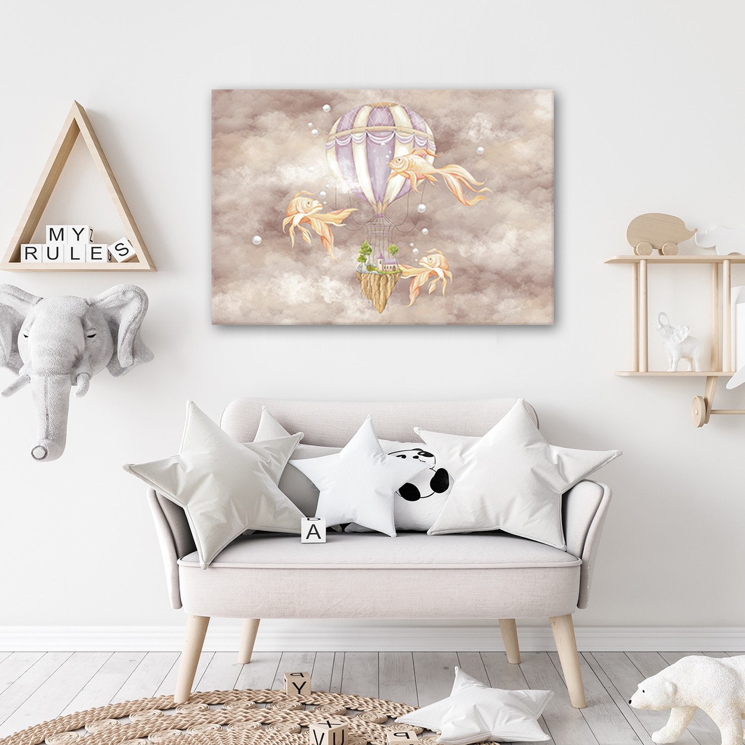 Leinwandbild, Heißluftballon fliegendes Haus und Fisch