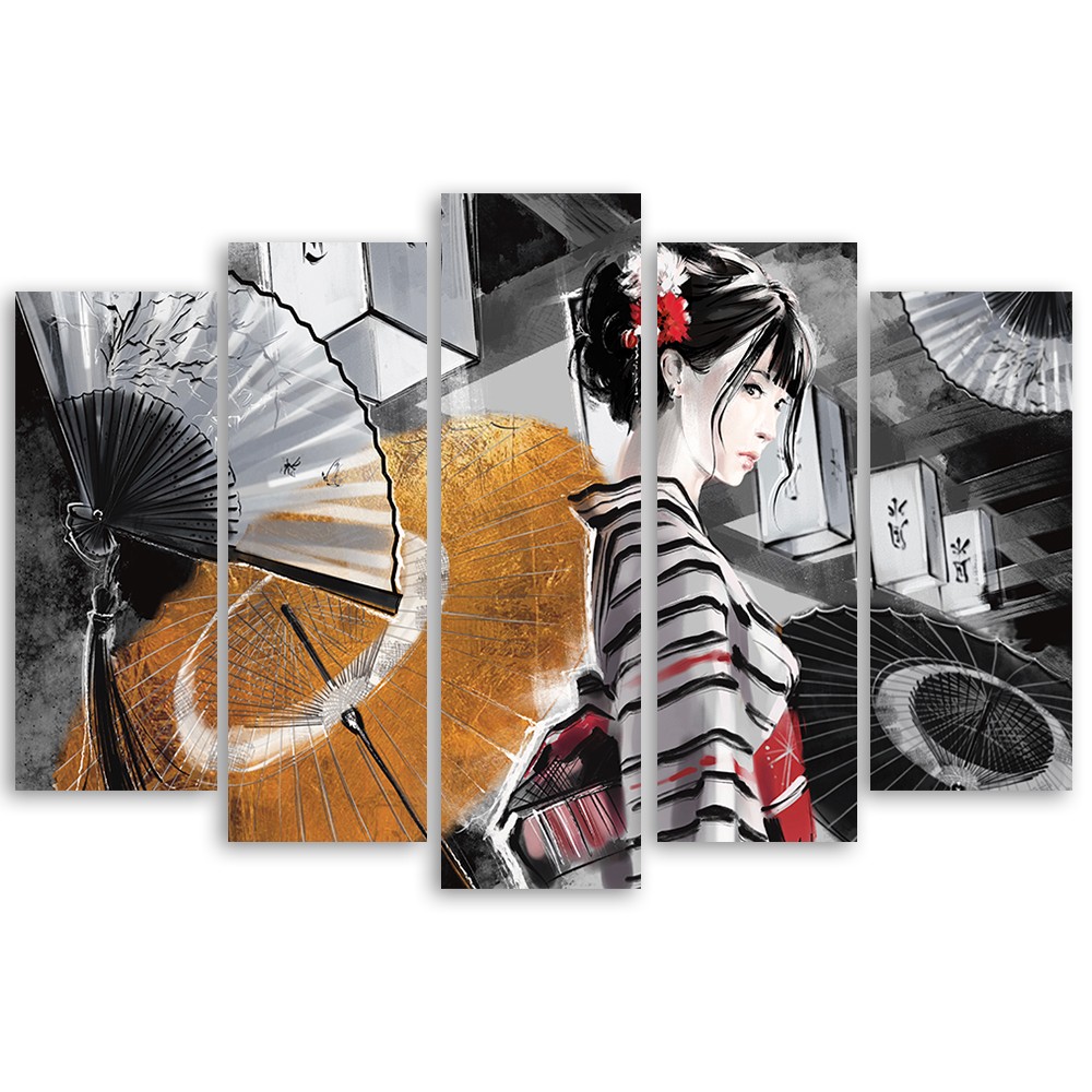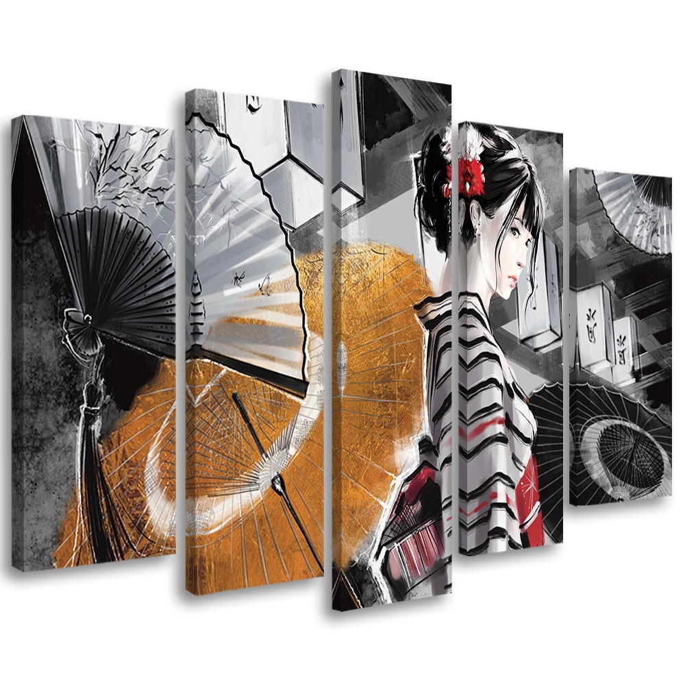 Leinwandbild 5 teilig, Geisha mit einem Fan