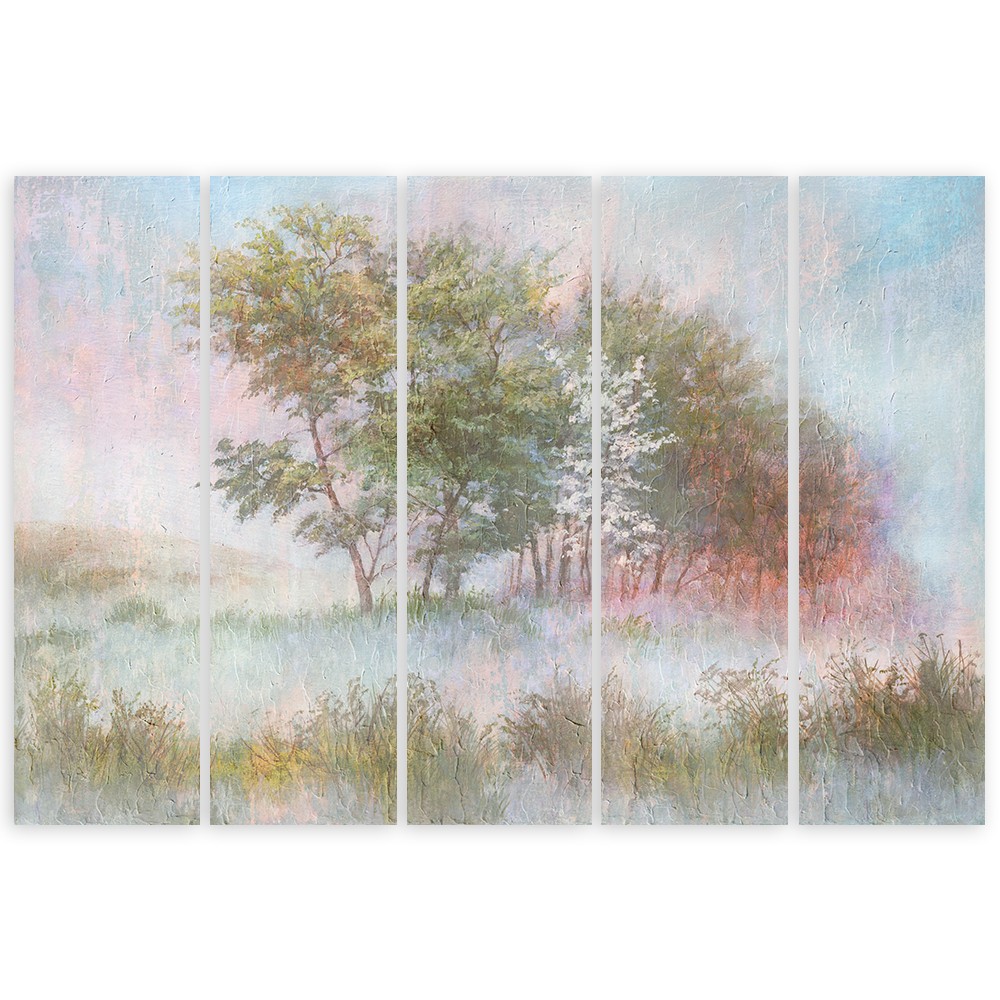 Leinwandbild 5 teilig, Bäume auf einer nebligen Wiese