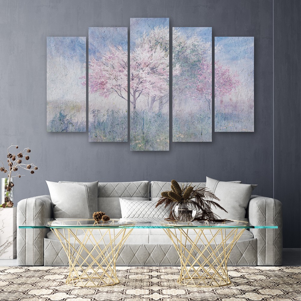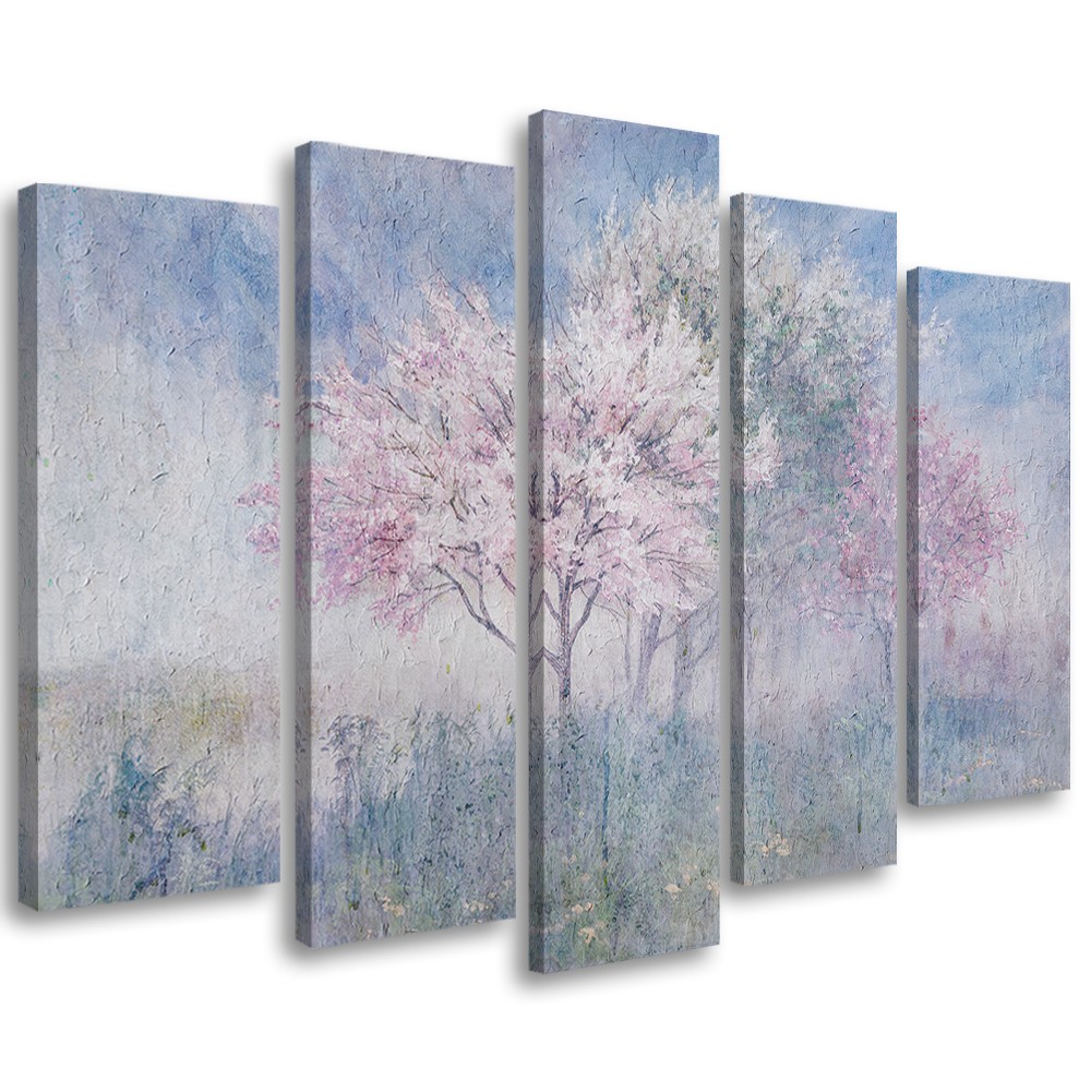 Leinwandbild 5 teilig, Ein blühender Baum in der alten Wiese verblasst