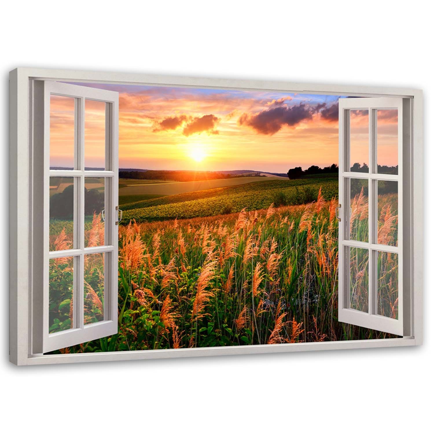 Leinwandbild, Fenster - Blick auf ein Blumenfeld