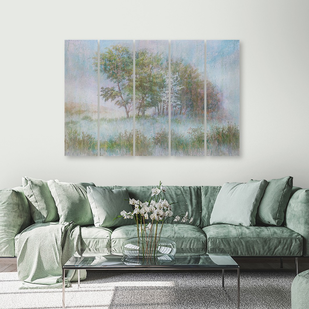 Leinwandbild 5 teilig, Bäume auf einer nebligen Wiese