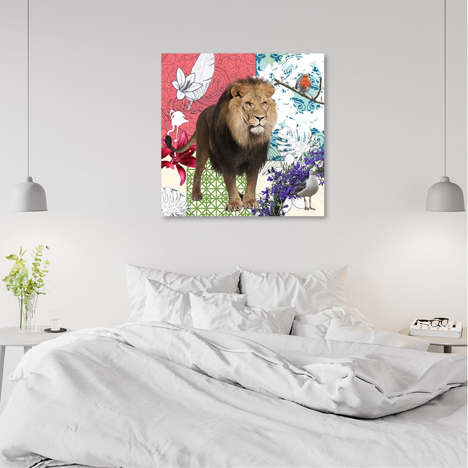 Leinwandbild, Löwe und Vögel Collage