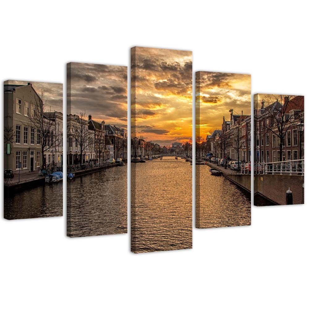 Leinwandbild 5 teilig, Stadt Fluss Sonnenuntergang