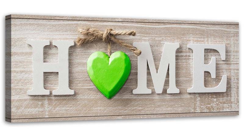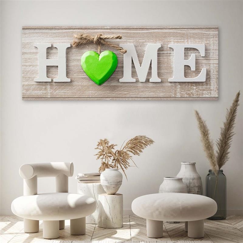 Leinwandbild, Hausaufschrift mit grünem Herz auf hellem Holz