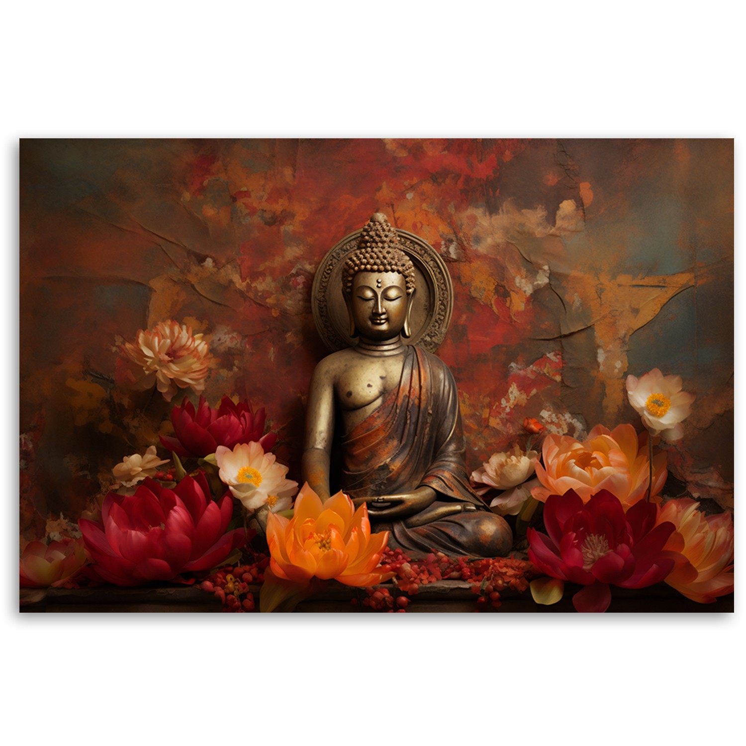 Leinwandbild, Meditierender Buddha und bunte Blumen