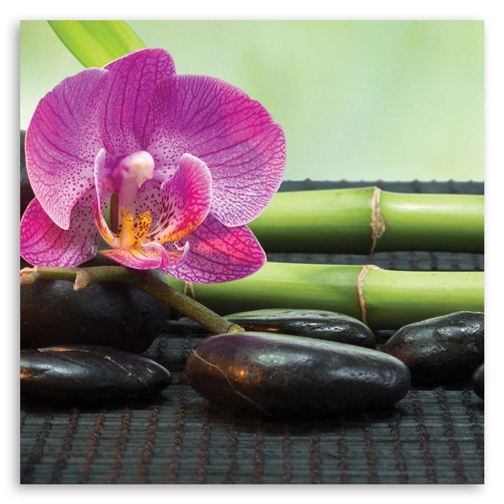 Leinwandbild, Blühende Orchidee auf schwarzen Steinen